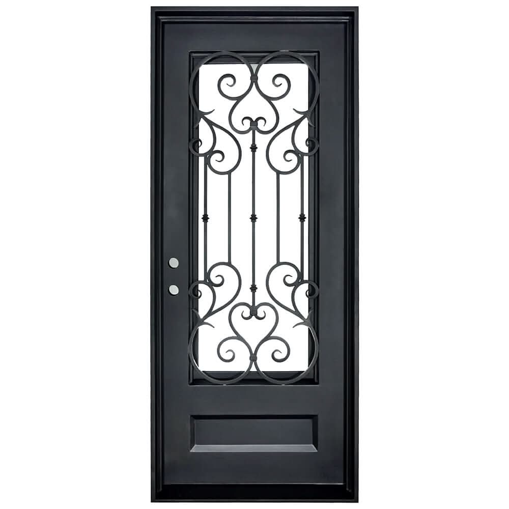 This single iron door is intricately designed and will add a touch of luxury to your home. It features a stunning rectangular bottom panel and unique scrollwork that draws inspiration from the elegance and glamour of New York City. Bring the style of the Big Apple to your doorstep with this ornate and meticulously crafted door.